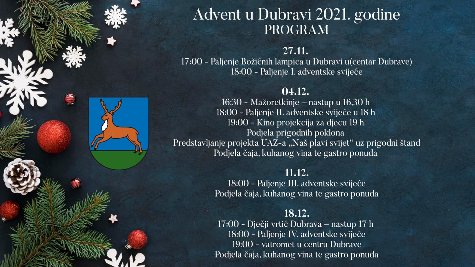 Paljenjem prve adventske svijeće u centru Dubrave u subotu je započeo ovogodišnji “Advent u Dubravi”. Općina je i ove godine pripremila zanimljiv program, a posjetitelji adventa moći će uživati i kuhanom vinu, čaju i gastro ponudi.