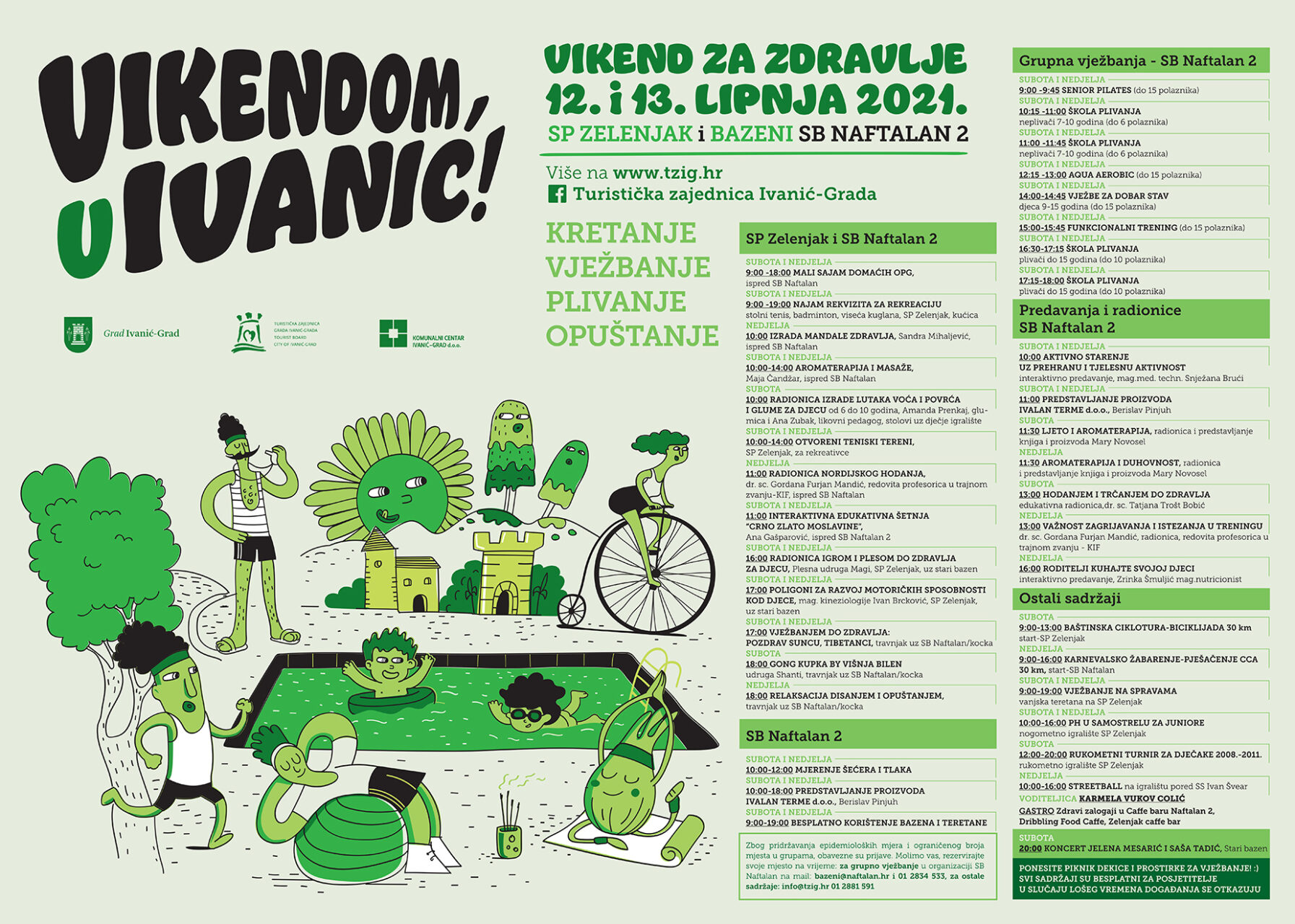 Kako bi svi ostali zdravi, sigurni i veseli, potrebno je voditi računa o pridržavanju epidemioloških mjera te je stoga ograničen broj mjesta u nekim grupama i poželjno je prethodno rezervirati svoje mjesto. Za grupno vježbanje u organizaciji SB Naftalan to možete učiniti e-mailom na: bazeni@naftalan.hr ili telefonskom najavom na 01 2834 533, a za ostale sadržaje na e-mail: info@tzig.hr ili na broj 01 2881 591.